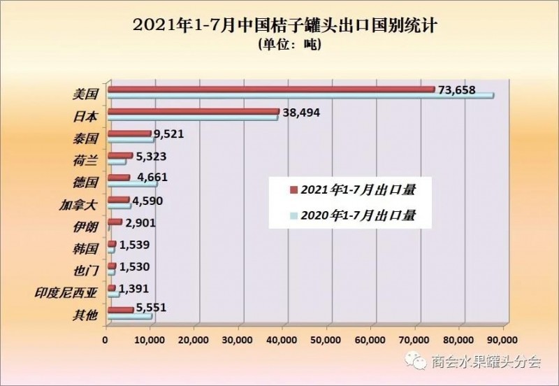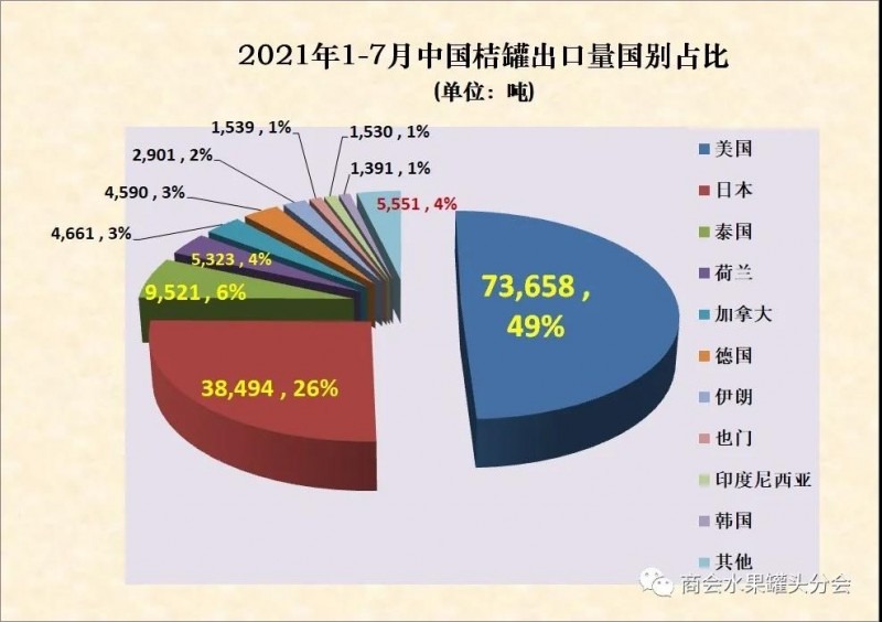 2021年1-7月,中國桔子罐頭出口的50個(gè)國家及地區(qū)中,出口量前十位的國家是:美國、日本、泰國、荷蘭、德國、加拿大、伊朗、韓國、也門和印度尼西亞。