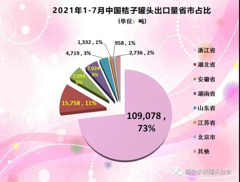2021年1-7月,中國出口桔子罐頭的15個(gè)省市中,出口量前七位的省市是:浙江、湖北、安徽、湖南、山東、江蘇和北京。