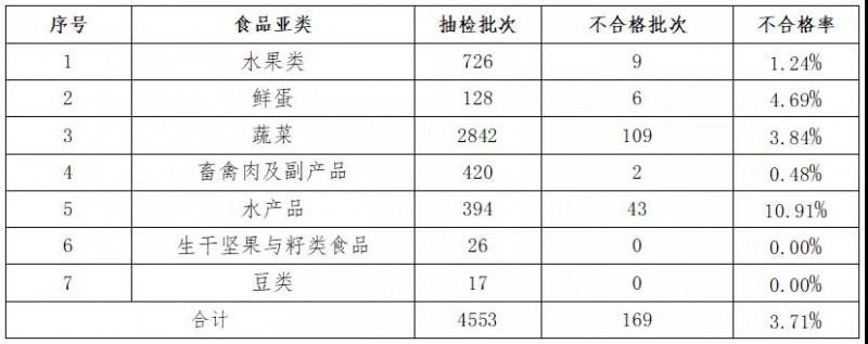 抽檢了畜禽肉及其副產(chǎn)品、水產(chǎn)品、蔬菜、水果類(lèi)、鮮蛋、生干堅(jiān)果與籽類(lèi)食品、豆類(lèi)7個(gè)食品亞類(lèi)的食用農(nóng)產(chǎn)品。