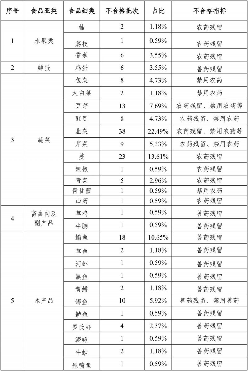 ★主要不合格項(xiàng)目類(lèi)別為農(nóng)獸藥殘留超標(biāo)、檢出禁用農(nóng)獸藥、檢出非食用物質(zhì)、重金屬等元素污染。