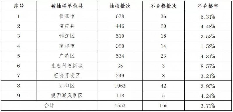 2021年上半年揚(yáng)州市食用農(nóng)產(chǎn)品專(zhuān)項(xiàng)監(jiān)督抽檢計(jì)劃共抽檢4553批次,發(fā)現(xiàn)不合格樣品169批次,不合格項(xiàng)目179項(xiàng)次。
