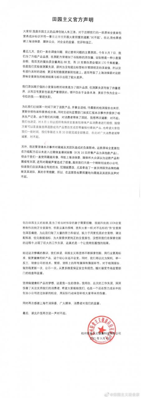 ? ? ??田園主義就全麥面包低標(biāo)能量發(fā)布道歉聲明