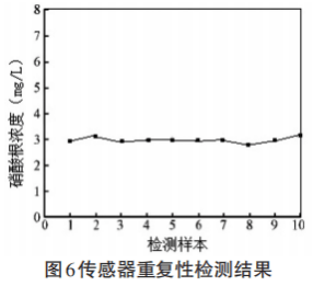 從圖中6中的研究結(jié)果可以獲知,差異指數(shù)的數(shù)值2.92%,這說明文中制定的感應(yīng)器具備較高的可重復(fù)性。敏感度檢測(cè):運(yùn)用最少驗(yàn)出幅值做為感應(yīng)器敏感度檢驗(yàn)的根據(jù)。配備0.1mL/L的硝酸鈉水溶液做為檢驗(yàn)樣版,在同一自然環(huán)境下運(yùn)用文中制定的控制器對(duì)磷酸鹽樣版開展反復(fù)檢驗(yàn)10次,標(biāo)準(zhǔn)偏差(SD)的數(shù)值為0.0228,敏感度檢驗(yàn)公式計(jì)算為: