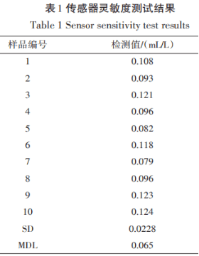 MDL=3.143δ,(δ為對(duì)同一樣版反復(fù)檢驗(yàn)10次獲得的標(biāo)準(zhǔn)偏差),最終獲得文中制定的感應(yīng)器的最少檢驗(yàn)幅值為0.065mL/L。這說明文中制定的感應(yīng)器擁有 優(yōu)良的敏感度。實(shí)際的研究結(jié)果以下表1所顯示: