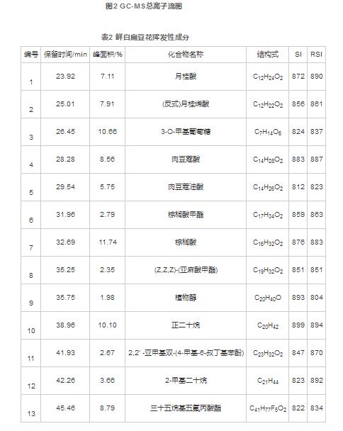 該項科學研究對鮮白扁豆花開展GC-MS剖析,獲得揮發(fā)物成份的總正離子流圖(見圖2)。選用NIST規(guī)范質(zhì)譜分析庫查找融合參考文獻,對揮發(fā)物成份開展明確辨別,依據(jù)正反面配對率≥800,共獲得13種成份,成份評定結果詳細表2。