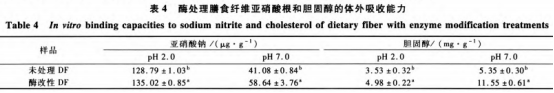 一些臨床流行病學研究表明,過多攝取亞硝酸鈉被指出對身體健康有危害,并有可能提升患惡性腫瘤的風險性。表4展示了酶改性材料前后左右DF的亞硝酸根吸收力(NIAC),酶改性材料后NIAC在仿真模擬結(jié)腸和胃的pH下均明顯提升(P<0.05)。結(jié)果顯示,酶改性材料后有利于避免過多亞硝酸鈉造成的身體中毒了。除此之外,發(fā)覺NIAC在pH2.0的標準下有更多的吸收力,表明DF在胃中比在腸里能消化吸收大量的亞硝酸根。不一樣pH下NIAC中間的差距可能是由DF中的阿魏酸造成的,酚酸官能團對亞硝基有極強的粘附功效,但在結(jié)腸自然環(huán)境中,因為pH值的上升促使阿魏酸上的羧基產(chǎn)生離解,進而抵觸NO2–,危害了活性炭吸附實際效果。