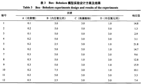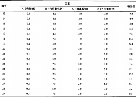 挑選殼聚糖加上量、里層氯化鈣加上量、海藻酸鈉加上量和表層氯化鈣加上量做為四個必須提升的技術主要參數,以燕麥片顆粒物的損壞度做為實體模型調優(yōu)的自變量,29組單獨研究的效果見表3。