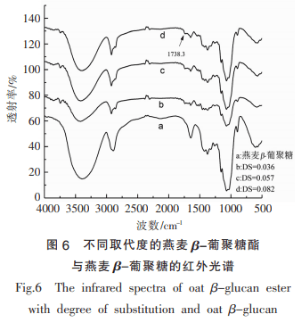 從圖6能夠 明確地見(jiàn)到,歷經(jīng)聚醚親水性改性材料后的燕麥片β-聚糖與原燕麥片β-聚糖的紅外光譜圖較大 的區(qū)分取決于1738.3cm-1處發(fā)生了新的峰。1738.3cm-1處新發(fā)生的峰是因?yàn)轷ヴ驶饎?dòng)造成,且從圖上能夠看得出,峰的抗壓強(qiáng)度伴隨著反應(yīng)速度的增加而強(qiáng)大,即伴隨著取代度的提升峰抗壓強(qiáng)度提升,能夠證實(shí)歷經(jīng)聚醚親水性改性材料后的燕麥片β聚糖引進(jìn)了酯羰基,進(jìn)而認(rèn)證燕麥片β-聚糖與聚醚中間的確發(fā)生了酯化反應(yīng)。