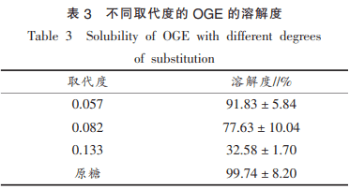 如表3所顯示,OGE的溶解性較原燕麥片β-聚糖的溶解性有不一樣水平的減少。伴隨著OGE取代度的提升,溶解性快速降低。造成這些情況的首要因素是加入了聚醚這類(lèi)親水性官能團(tuán),取代度越高,引進(jìn)的親水性集團(tuán)公司越多,其溶解性相對(duì)應(yīng)越低。