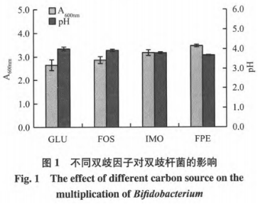 在改進(jìn)MRS培養(yǎng)液中,各自添加2%FPE(20mg/mL)、異麥芽糖低聚木糖(IMO)和低聚果糖(FOS),對(duì)照實(shí)驗(yàn)為葡萄糖水(GLU)培養(yǎng)液。于121℃下殺菌20min,接種量為6%,37℃厭氧發(fā)酵塑造48h,測(cè)量各培養(yǎng)液的雙岐桿菌的在600nm的OD值A(chǔ)600nm。和pH,反復(fù)測(cè)量3次。