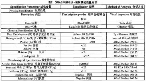 英國FDA“酵母菌β-聚糖-般認(rèn)可安全性公示”(Thegenerallyrecognizedassafe(GRAS)statusofyeastbeta-glucanforuseasafoodingredient)中包括酵母菌β-聚糖的安全性性能指標(biāo)。該公示主要內(nèi)容包含酵母菌β-聚糖的生產(chǎn)過程、成分、食品類中的增加量、曝露點(diǎn)評及其GRAS基本直接證據(jù)。在我國輕工行業(yè)國家標(biāo)準(zhǔn)QB/T4572-2013《酵母β-葡聚糖》關(guān)鍵參照此項國家標(biāo)準(zhǔn)制訂。表2為GRAS中酵母菌β-聚糖的產(chǎn)品質(zhì)量標(biāo)準(zhǔn),一部分指標(biāo)值與在我國輕工行業(yè)國家標(biāo)準(zhǔn)有差別,比如:蛋白質(zhì)成分<10%;人體脂肪<20%;灰份<5%;糖類與碳水化合物≥80%。從物理化學(xué)規(guī)定上看,在我國國家標(biāo)準(zhǔn)在一部分指標(biāo)值上比英國FDA規(guī)范愈發(fā)嚴(yán)苛。衛(wèi)生要求上,GRAS公示要求了微生物菌種限定指標(biāo)值,包含菌落總數(shù)、酵母及黃曲霉菌、大腸埃希菌限定,及其嚴(yán)禁驗(yàn)出的細(xì)菌種類。