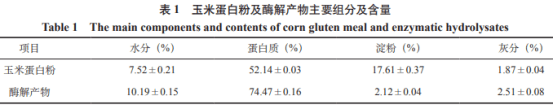 試驗常用玉米蛋白粉為淡黃色粉末狀,有淺淺的腥味兒。玉米蛋白粉及酶解物質(zhì)關(guān)鍵成分及成分見表1。能夠看得出,玉米蛋白粉中主要成分為蛋白和木薯淀粉,在其中,蛋白質(zhì)含量為52.14%,木薯淀粉含水量為17.61%。根據(jù)酶法裝飾之后制取的酶解物質(zhì)蛋白質(zhì)含量明顯升高,由原先的52.14%升高至74.47%,木薯淀粉成分明顯減少,主要是因為木薯淀粉難溶解于水,由原先的17.61%減少為2.12%。在酶解的環(huán)節(jié)中,充分考慮調(diào)整pH很有可能引進較多的鹽,在生產(chǎn)加工中較難去除,因而酶解均在弱酸性情況下開展,試品灰份成分改變并不大,防止了比較復(fù)雜的試品除鹽加工工藝。