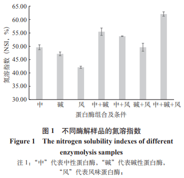 固定不動底物濃度值為15%,酶解溫度為50℃,酶解時間為4h,各酶濃度值均為1%,各自對中性蛋白酶、堿性蛋白酶及其口味胰蛋白酶的單酶及復(fù)合酶解標準完成了剖析,結(jié)果見圖1。