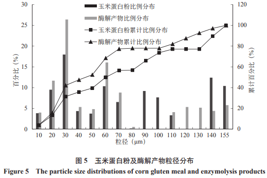 由圖5能夠看得出,與玉米蛋白粉對比,經(jīng)酶解之后酶解物質(zhì)顆粒物較小,粒度基本上遍布在10~60μm中間,約占總?cè)莘e的68%,而玉米糝僅為50%。酶解物質(zhì)粒度遍布在140~155μm處的很少,約占10%,遠小于玉米蛋白粉的23%。因而,相對性于玉米蛋白粉而言,酶解物質(zhì)更非常容易被身體消化,溶解度更強。