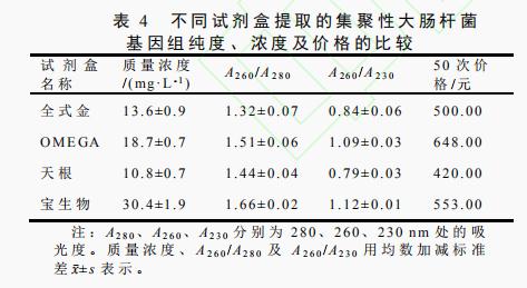 各自汲取1 mL塑造留宿的聚集性大腸埃希菌菌懸浮液,依照4種病菌基因獲取檢測試劑盒給予的規(guī)范方式獲取聚集性大腸埃希菌基因,不一樣檢測試劑盒各自獲取的聚集性大腸埃希菌基因純凈度及濃度值見表4。基因濃度值在10.8~30.4 mg/L,天根檢測試劑盒獲取的基因DNA的濃度值最少,只有10.8mg/L;寶生物試劑盒獲取的濃度值最大,但也僅為30.4 mg/L。純粹的基因DNA的260 nm處的OD值A(chǔ)260與280 nm處的OD值A(chǔ)280的比率1.8,較干凈的基因DNA的A260與230 nm處的OD值A(chǔ)230的比率超過2.0,所獲取的基因DNA的A260/A280的值低于1.66,很有可能試品有蛋白環(huán)境污染;A260/A230的值低于1.12,推斷基因DNA試品很有可能帶有有機化學(xué)實驗試劑或鹽正離子等污染物質(zhì)。