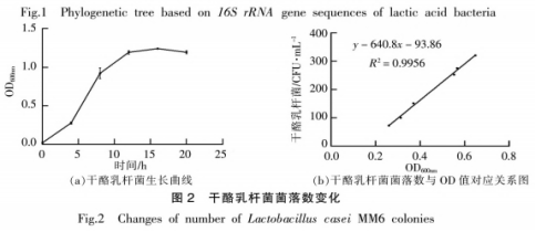 從培養(yǎng)液中任意選擇乳白色、網(wǎng)形的突起菌體,經(jīng)雙氧水酶和革蘭氏染色實驗后,挑選出過氧化氫酶呈陰性、革蘭氏陽性菌轉(zhuǎn)錄組測序,經(jīng)同宗序列比對后,共評定出4株干酪乳桿菌和2株糞腸球菌。由圖1的系統(tǒng)發(fā)育進(jìn)化樹能夠看得出,共監(jiān)測到2個屬:腸球菌屬和乳酸桿菌屬。MMl(干酪乳桿菌)、MM6(干酪乳桿菌)、MM8(副干酪乳桿菌)、MM9(干酪乳桿菌)和YLl(屎腸球菌)、YM2(屎腸球菌)產(chǎn)生了2個種群并與相應(yīng)的方式菌種聚在一起,進(jìn)一步認(rèn)證了分子結(jié)構(gòu)學(xué)評定結(jié)論的穩(wěn)定性。