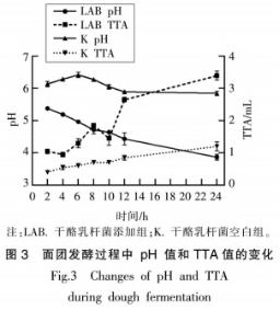 如圖所示3所顯示,伴隨著發(fā)酵時間增加,空缺組(K)pH值和TTA值轉(zhuǎn)變 并不大,殊不知干酪乳桿菌加上組(LAB)的pH值逐步減少,24h后低至3.9,TTA值與pH值轉(zhuǎn)變 呈相對的發(fā)展趨勢。干酪乳桿菌歸屬于異形發(fā)醇乳酸菌飲料,發(fā)醇全過程中乳酸菌、冰醋酸等有機物的新陳代謝造成 面糊pH值降低、TTA值提升。