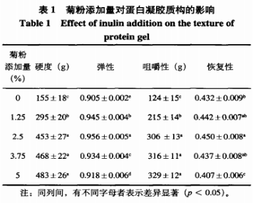 由表1得知,疑膠強(qiáng)度隨菊粉加上量的提高而逐步升高。從0%逐漸到2.5%,疑膠強(qiáng)度提升發(fā)展趨勢比較顯著,在2.5%時(shí),疑膠強(qiáng)度為453g,2.5%到5%疑膠強(qiáng)度盡管也是有提升,但差距不明顯(p>0.05);疑膠延展性的轉(zhuǎn)變 中,菊粉加上量為2.5%的延展性較大 ,為0.956,5%的延展性最少,為0.918;咬合性隨菊粉加上量的提高呈逐步增長的趨勢,加上量在2.5%~5%中間時(shí),差別不明顯(p>0.05);恢復(fù)先上升再降低,且在2.5%時(shí)到達(dá)最高值,為0.450,接著呈下降趨勢。