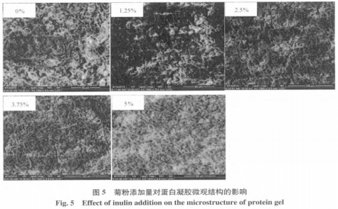 由圖5得知,未加上菊粉的肌原纖維蛋白質(zhì)疑膠內(nèi)部構(gòu)造疏松不光滑、松散多孔結(jié)構(gòu)。根據(jù)添加不一樣加上量菊粉產(chǎn)生的疑膠,整體能夠得到不錯(cuò)的網(wǎng)絡(luò)架構(gòu)。菊粉加上量為2.5%時(shí)生成的疑膠構(gòu)造最好是,比較高密度勻稱。可是伴隨著菊粉加上量的不斷提升,到加上量為5%時(shí),產(chǎn)生了相對來說比較大的腔室構(gòu)造,疑膠網(wǎng)絡(luò)架構(gòu)越來越不足細(xì)膩密切,直徑發(fā)生不均衡狀況。這有可能是由于加上過多的菊粉,會阻攔肌原纖維蛋白質(zhì)分子結(jié)構(gòu)進(jìn)一步盤繞化學(xué)交聯(lián),導(dǎo)致一部分地區(qū)蛋白質(zhì)網(wǎng)絡(luò)架構(gòu)疏松,造成 蛋白質(zhì)疑膠管理體系強(qiáng)度與保水溶性等無顯著升高,這與劉英麗的分析結(jié)論一致。