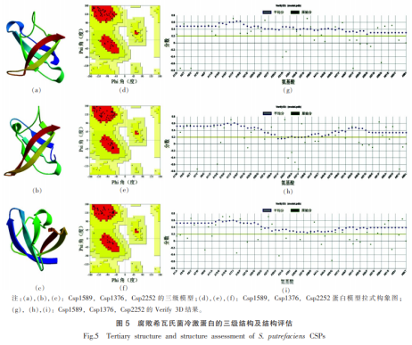 為更強掌握冷激蛋白質潛在性的微生物作用,剖析其蛋白質的空間布局。將海產品腐壞希瓦氏菌冷激蛋白質的碳水化合物編碼序列遞交到PSIPRED預測分析其二級結構,結果見圖4。典型性的冷激蛋白質的二級結構包括五個β伸縮,預測分析獲得的二級結構與這一結果大概相符合,Csp1589和Csp1376二級結構的最后一個β伸縮發(fā)生斷塊,這可能是天冬酰胺預測分析真實度太低而致。