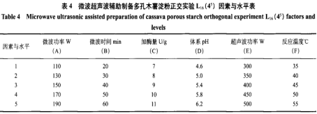 依據(jù)單要素實驗,設計方案L16(45)實驗,得到微波加熱超音波輔助酶打法制取多孔結構木薯淀粉的最好工藝技術標準。
