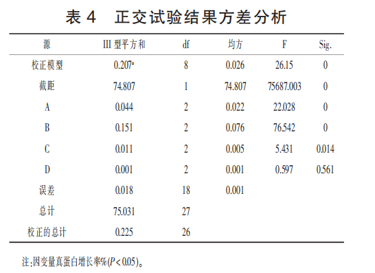 由表 3 得知,4 個要素對有機(jī)化學(xué)氮年增長率危害的層次次序?yàn)?B>A>C>D,在其中,硫酸銨加上量對土豆薯渣發(fā)醇生產(chǎn)制造菌 體蛋白質(zhì)飼料中真蛋白質(zhì)成分提升 的危害較為明顯, 次之為薯渣與麥麩的品質(zhì)占比組成與塑造溫度,危害很小的要素為塑造時間。 最適合固態(tài)發(fā)酵生 產(chǎn)菌體蛋白質(zhì)飼料的加工工藝搭配為 A2B2C2D1。 即薯 渣與麥麩的品質(zhì)例為 85S 15F, 硫酸銨加上量為2%,塑造溫度 32 ℃,塑造時間 72 h。 根據(jù)正交實(shí)驗(yàn)方差分析結(jié)果顯示(表 4),前三個要素 A、B、C 對土豆薯渣發(fā)醇生產(chǎn)制造菌體蛋白質(zhì)飼料真蛋白質(zhì)提高 率的危害均具備明顯差異水準(zhǔn)(P < 0.05),要素D 對真蛋白質(zhì)年增長率的危害差別不明顯,因而,挑選 短期內(nèi)固態(tài)發(fā)酵省時省經(jīng)濟(jì)發(fā)展成本費(fèi)且成效顯著。
