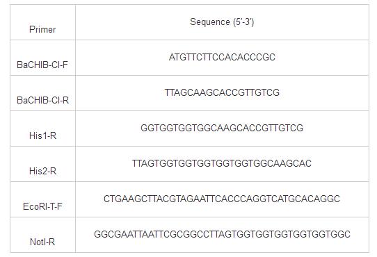 應(yīng)用高保真音響酶1-5TM2×Hight-FidelityMasterMix(MCLAB)增加除去信號肽區(qū)間的幾丁質(zhì)酶遺傳基因BaCHIB-T,并在C端加上6×His蛋白純化標(biāo)識。以排風(fēng)管菌cDNA為原始模版,事后PCR全過程先后應(yīng)用上一步增加物質(zhì)為模版,獲得目地精彩片段BaCHIB-T,實際引物設(shè)計如下所示:①.BaCHIB-Cl-F/R;②.BaCHIB-Cl-F和His1-R;③.BaCHIB-Cl-F和His2-R;④.EcoRⅠ-T-F和NotⅠ-R。