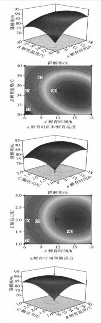 從圖6b能夠看得出,酶魅力相匹配的響應(yīng)值的曲線圖險峻,表明對AFB1的溶解率危害很大,而孵育時間相對應(yīng)的響應(yīng)值曲線圖相對性輕緩,說明孵育時間對AFB1溶解率的危害并不大,酶魅力和孵育時間的等值線類似環(huán)形,說明酶魅力和孵育時間的配對t檢驗對AFB1溶解率的危害較小;從圖6c能夠看得出,酶魅力相匹配的響應(yīng)值曲線圖相對性較陡,而孵育溫度相對應(yīng)的響應(yīng)值曲線圖較輕緩,說明酶魅力對AFB1溶解率危害很大,酶魅力和孵育溫度的等值線平扁,說明酶魅力和孵育溫度的配對t檢驗對AFB1溶解率的干擾很大。