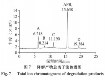 如圖所示7所顯示,AFB1經(jīng)漆酶溶解后檢驗到4個新的色譜儀峰,由峰形和分離度可看得出,各物質(zhì)分離出來實際效果不錯,且由保存期不一樣推斷溶解物質(zhì)不一樣。依據(jù)AFB1和溶解物質(zhì)的保存期分辨5種化學(xué)物質(zhì)的旋光性尺寸為A>B>C>AFB1>D。