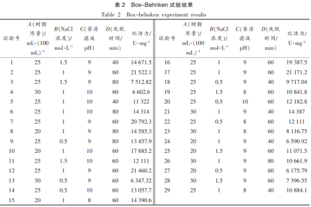 綜上所述,由單要素實(shí)驗(yàn)效果得知,陽離子交換最佳加工工藝標(biāo)準(zhǔn)為:雞蛋清滲瀝液環(huán)氧樹脂之比10∶2.5,pH9.0,NaCl(過柱液)濃度值1mol/L,過柱時(shí)間60min。從而,進(jìn)一步做Box-Behnken實(shí)驗(yàn)提升正離子互換法標(biāo)準(zhǔn),試驗(yàn)設(shè)計(jì)及結(jié)果如表2所顯示。