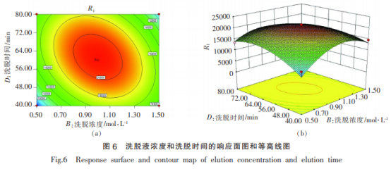 由式子得知,溶菌酶比魅力和4個(gè)變量中間具備明顯線性相關(guān)。線性回歸方程的二次項(xiàng)系數(shù)較為大,交互項(xiàng)指數(shù)中AD、BD的互動(dòng)指數(shù)非常大,表明環(huán)氧樹脂使用量和過柱時(shí)間、NaCl濃度值和過柱時(shí)間之間的互動(dòng)效用非常大,AB、AC的互動(dòng)指數(shù)很大,表明環(huán)氧樹脂使用量和NaCl濃度值中間、環(huán)氧樹脂使用量和pH值中間互動(dòng)效用很大,而BC、CD的互動(dòng)指數(shù)較為小,表明NaCl濃度值和pH值中間、pH值和過柱時(shí)間之間的互動(dòng)效用小。
