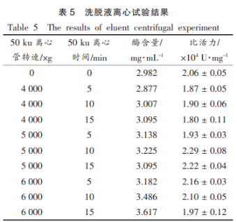 將以上提升標(biāo)準(zhǔn)制取酶液做進(jìn)一步超濾膜純化提升,將酶液放置截流量為50ku的超濾離心管中,于4000~6000×g,離心式5~15min,去除雜蛋白質(zhì),棄去離心管架頂層液。再將下一層液放置截流量為3ku的超濾離心管中,于6500×g,離心式20min,保存頂層截流液,測(cè)量其酶成分及比魅力,結(jié)果如表5所顯示。得知,伴隨著轉(zhuǎn)數(shù)的上升,酶成分逐步上升,而溶菌酶比魅力呈先升高后降低的發(fā)展趨勢(shì),推斷因?yàn)殡x心式轉(zhuǎn)速比過低促使溶菌酶被一部分截流在頂層,而離心式轉(zhuǎn)速比過高,雖能將溶菌酶所有通過下一層,但一部分雜蛋白質(zhì)不可以有效的除去,一樣不被截流,或者溶菌酶在快速離心式歷程中有一定的損害,致酶魅力降低。且伴隨著離心式時(shí)間增加,比魅力有所增加,殊不知離心式時(shí)間不適合太長(zhǎng),太長(zhǎng)的離心式時(shí)間會(huì)使工作效率減少,不利大規(guī)模生產(chǎn)。故當(dāng)溶菌酶比魅力為最高值時(shí),挑選50ku超濾離心管,在5000×g標(biāo)準(zhǔn)下離心式10min。
