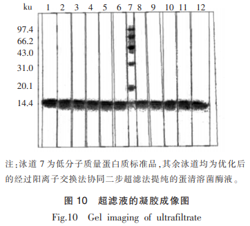 由圖8、圖9比照得知,過柱液和超滲瀝液均可在14.4ku看到顯著雜帶,與雞蛋清溶菌酶的相對(duì)性分子質(zhì)量相符合。除此之外,只歷經(jīng)陽(yáng)離子交換的過柱液的雜蛋白質(zhì)及殘?jiān)}較多,危害純凈度,而過柱液歷經(jīng)二步超濾膜后,雜蛋白質(zhì)、殘?jiān)}較少,獲取的溶菌酶純凈度較高。