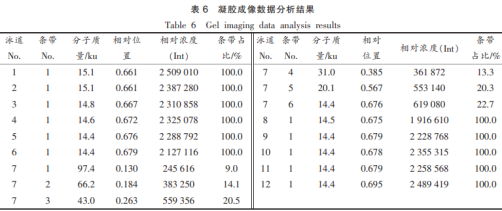 采用歷經(jīng)陽(yáng)離子交換協(xié)作二步超濾膜法純化的雞蛋清溶菌酶液,測(cè)量溶菌酶的純凈度,結(jié)果如圖所示10所示,并且用ImageLab5.2.1手機(jī)軟件對(duì)圖片開展剖析,所得的數(shù)據(jù)信息如表6所顯示。