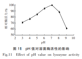 由圖11得知,隨pH值的持續(xù)上升,溶菌酶的相對(duì)性酶活呈先升高后降低的發(fā)展趨勢(shì),溶菌酶在pH5~8均可維持85%之上的相對(duì)性酶活,在pH數(shù)值3~4時(shí)仍有70%之上的相對(duì)性酶活,在pH數(shù)值7.0時(shí),酶魅力做到最高值,可推斷,溶菌酶的適宜pH值約為7.0。pH值危害溶菌酶酶活的因素可能是因?yàn)閜H值的更改對(duì)底物溶壁微革蘭陰性桿菌的情況造成危害,也可能是pH值促使酶的通電情況更改,進(jìn)而危害酶的活性。