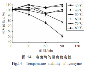 由圖14得知,在30~60℃時(shí),溫度對(duì)酶活危害并不大,溶菌酶維持較高可靠性;在70℃隔熱保溫一段時(shí)間,酶活遲緩降低,90min后,比魅力減少為初值的78%;而在80℃隔熱保溫一段時(shí)間,酶活降低速度較高,90min后,比魅力降為初值的52%??赡苁请S環(huán)境溫度上升,溶菌酶轉(zhuǎn)性降解水平上升,降解速率加速。