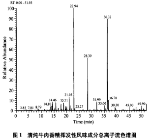 選用固相微萃取原理,對熱反應(yīng)方法制取的清燉牛肉香料中揮發(fā)物成份開展GC-MS剖析,清燉牛肉香料揮發(fā)物口味成份總離子流色譜如圖所示1所顯示。