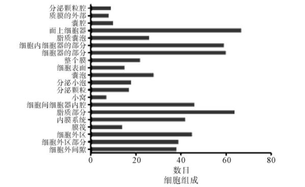 將所取得的81個(gè)靶標(biāo)導(dǎo)進(jìn)STRING數(shù)據(jù)庫(kù)查詢開(kāi)展GO作用聚集剖析,獲得GO內(nèi)容1 892個(gè),在其中微生物全過(guò)程內(nèi)容1 648個(gè),細(xì)胞組成內(nèi)容82個(gè),分子結(jié)構(gòu)作用內(nèi)容162個(gè),各自占73%、13%、14%.在其中,微生物全過(guò)程關(guān)鍵涉及到碳?xì)浠衔镄玛惔x全過(guò)程的正管控、生物大分子新陳代謝全過(guò)程的正管控、體細(xì)胞全過(guò)程的正管控、刺激性反映的調(diào)整、體細(xì)胞對(duì)有機(jī)化學(xué)成分的反映、體細(xì)胞對(duì)有機(jī)化學(xué)刺激性的化學(xué)反應(yīng)及對(duì)含氧量化學(xué)物質(zhì)的反映等全過(guò)程;分子結(jié)構(gòu)作用關(guān)鍵涉及到激話轉(zhuǎn)錄因子融合、蛋白融合、酶融合及蛋白異構(gòu)化活力等作用;細(xì)胞組成涉及到在膜融合體細(xì)胞器、細(xì)胞核部、胞外區(qū)及細(xì)胞結(jié)構(gòu)等地區(qū).3個(gè)支系總數(shù)排名前20位有關(guān)內(nèi)容信息內(nèi)容柱形圖如圖所示2所顯示.