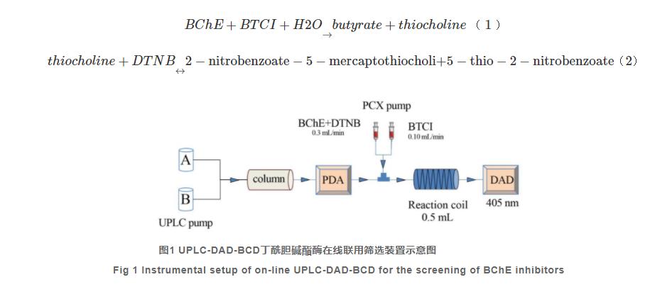 UPLC-DAD-BCD聯(lián)用儀器設(shè)備設(shè)備見圖1。水溶液流路選用三通管和同樣直徑的PEEK管聯(lián)接。柱后衍化儀泵一為酶和DTNB混和水溶液,泵二BTCI水溶液。提取液歷經(jīng)UPLC離子交換柱分離出來后,在PDA探測(cè)器表明指紋圖譜,再與柱后衍化儀中的水溶液反映,經(jīng) DAD探測(cè)器檢驗(yàn)獲得活力圖普,酶 DTNB、BTCI水溶液流動(dòng)速度各自為0.30和0.10 mL·min-1,反映管0.5 mL,在405 nm檢驗(yàn)酶抑止活力圖普。其反映基本原理如下所示:當(dāng)柱后衍化儀以穩(wěn)定的流動(dòng)速度運(yùn)送BChE與DTNB混和水溶液和BTCI水溶液,3種水溶液在反映管內(nèi)持續(xù)反映,轉(zhuǎn)化成的5-thio-2-nitrobenzoate為淡黃色物質(zhì),可在405 nm處檢驗(yàn)獲得穩(wěn)定基準(zhǔn)線。當(dāng)UPLC分離出來出活性物質(zhì)進(jìn)到BChE反映管理體系,淡黃色物質(zhì)量減少,與此同時(shí)在DAD探測(cè)器上邊便會(huì)展現(xiàn)倒峰,進(jìn)而完成BChE緩聚劑的在線監(jiān)測(cè)。
