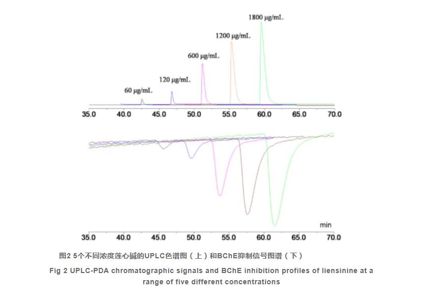 蓮子芯被報(bào)導(dǎo)具備BChE抑制效果,依照“2.3.2”項(xiàng)下的方式 ,應(yīng)用UPLC-DAD-BCD對(duì)蓮芯堿抑止活力開展剖析,見圖2。圖2為五個(gè)不一樣濃度值蓮芯堿的UPLC圖普和BChE抑止峰(60,120,600,1 200和 1800 μg·mL-1),以活力指紋圖譜的倒峰總面積為橫坐標(biāo)軸(X),蓮芯堿濃度值為縱軸(Y),獲得蓮芯堿的量效曲線方程Y= 351.56X3-1 098.8X2 1 473X-32.205 (R² = 0.999 7),說明UPLC-DAD-BCD方式可以用以酶抑制劑的挑選和活力點(diǎn)評(píng)。由圖二上和下相匹配峰的保存期可獲得在線監(jiān)測(cè)的時(shí)間延遲為2 min上下。