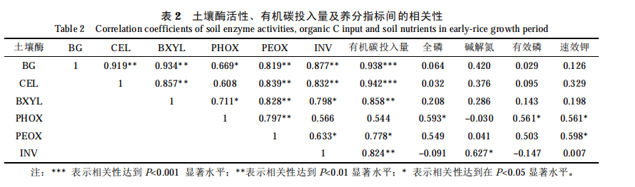 各解決土壤層酶促反應(yīng)與其說有機(jī)碳投放量及一部分營養(yǎng)物質(zhì)指標(biāo)值的相關(guān)分析說明(表 2):除 PHOX 外,別的5 種酶與其說有機(jī)碳投放量呈明顯成正比;這說明與碳資金周轉(zhuǎn)有關(guān)的 6 種酶在推動土壤肥力轉(zhuǎn)換全過程中,不但具備特有特點(diǎn),與此同時也具有著關(guān)聯(lián)性關(guān)聯(lián)。但因為土壤層酶參加土壤層物質(zhì)循環(huán)的并且會遭受土地質(zhì)量的整體危害,因而參加土壤層碳資金周轉(zhuǎn)的 6 種酶僅與一部分土壤層營養(yǎng)物質(zhì)指標(biāo)值具備一定的關(guān)聯(lián)性。從表 2 結(jié)果由此可見:PHOX與全磷、合理磷和速效性鉀這 3 個營養(yǎng)物質(zhì)指標(biāo)值相互之間具有正相關(guān)的關(guān)聯(lián),且做到明顯水準(zhǔn)(P<0.05);PEOX 與速效性鉀中間具有明顯的成正比關(guān)聯(lián);INV 與堿解氮中間具有明顯的成正比關(guān)聯(lián)。