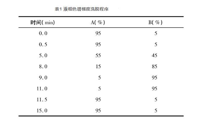 離子交換柱:WatersAcquityUPLCHSST3(2.1mm×10cm,1.8μm);柱溫:30℃;流動速度:0.3ml/min;進(jìn)樣量:10μl;流動性相構(gòu)成:A:5mmol/L乙酸銨溶液,B:工業(yè)甲醇-乙腈(1∶1,V/V),梯度方向過柱,見表1。