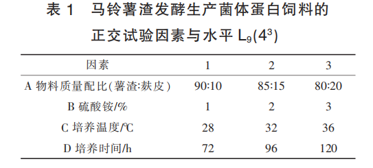 在單要素實(shí)驗(yàn)的根基上,以原材料品質(zhì)配制(A)、硫酸銨加上量(B)、塑造溫度(C)和塑造時(shí)間(D)為調(diào)查對(duì) 象,以真蛋白質(zhì)年增長(zhǎng)率為指標(biāo)值(Y),明確提升土豆薯渣固態(tài)發(fā)酵菌體蛋白質(zhì)的最好工藝技術(shù)標(biāo)準(zhǔn),設(shè)計(jì)方案 4 要素 3 水準(zhǔn) L9(34)正交實(shí)驗(yàn),正交實(shí)驗(yàn)的要素與水準(zhǔn)見表 1。 對(duì)于土豆薯渣固態(tài)發(fā)酵最好工 藝主要參數(shù) 開展 發(fā) 酵原 料為 200 kg 的中實(shí)驗(yàn) 證 試 驗(yàn),小試地址布局于黑龍江農(nóng)懇研究院佳木斯 分院生物發(fā)酵小試生產(chǎn)車間。 運(yùn)用木制板制造的發(fā) 酵盒(50 cm×50 cm)填裝原材料高寬比 6 ~ 8 cm,發(fā) 酵生產(chǎn)車間殺菌后將菌苗與發(fā)醇盒里原材料充足攪拌 蓋緊無菌紗布保濕補(bǔ)水,加工工藝主要參數(shù)與最好加工工藝主要參數(shù)保 持一致,認(rèn)證加工工藝主要參數(shù)產(chǎn)業(yè)化制造的穩(wěn)定度及穩(wěn)定性。