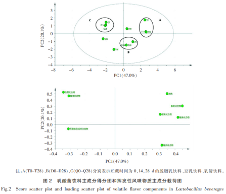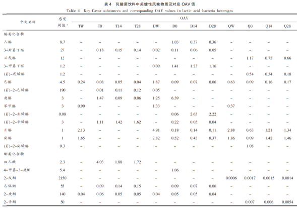 乳清蛋白飲品在進(jìn)行發(fā)酵后及貯藏期與正戊醛、(E)-戊烯醛、2-壬醇、壬醛、癸醛、1-庚醇等6種OAV≥0.1的揮發(fā)有機(jī)物有極強(qiáng)的關(guān)聯(lián)性,正戊醛、壬醛、癸醛等代烴化學(xué)物質(zhì)具備清新的清香味、人體脂肪氣場(chǎng),1-庚醇具備土層、油品的口味。