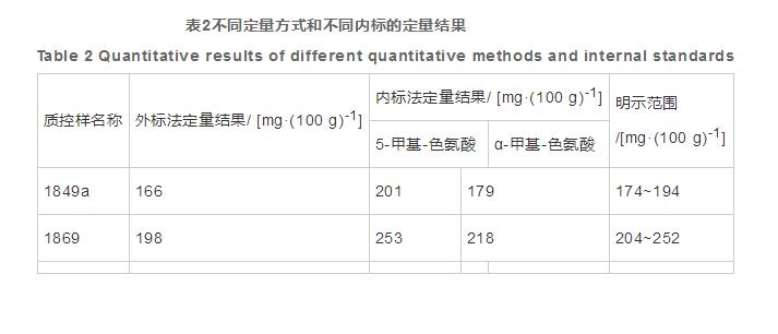 依次挑選了NIST質(zhì)量控制樣1849a和1869做為研究對象,各自添加5-羥基-谷氨酸和α-羥基-谷氨酸內(nèi)標后,開展堿水解反應。表2不一樣定量分析方法和不一樣內(nèi)標底定量分析數(shù)據(jù)顯示,同樣標準下為α-羥基-谷氨酸做為內(nèi)標獲得的兩個質(zhì)量控制樣的成分均能達到明確的范疇,而5-羥基-谷氨酸做為內(nèi)標獲得的結果較高,外標法定量分析的效果則達不上質(zhì)量控制樣的明確低限。以α-羥基-谷氨酸做為內(nèi)標來定量分析能獲得更加確切的結果。