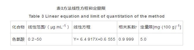 精確汲取谷氨酸標液(100 μg/mL)20、100和500 µL、1.0、2.0和5.0 mL于10 mL容量瓶中,添加100 µL內(nèi)標(1 mg/mL)切削液,自來水滴定劑至標尺,攪拌后獲得濃度值分別為0.2、1.0、5.0、10.0、20.0、50.0 μg/mL的規(guī)范工作中水溶液,各自將規(guī)范系列產(chǎn)品切削液依照濃度值由低到高的次序引入液相色譜中,測得相對應色譜儀峰的峰總面積,以系列產(chǎn)品混和規(guī)范切削液的含量為橫坐標軸,以總體目標化學物質(zhì)的峰總面積與內(nèi)標底峰總面積的比率為縱軸,制作標曲。相關系數(shù)r>0.999,遮蓋方式定量限和普遍試品的占比水準,線形優(yōu)良。將S/N>10且能精確定量分析的最少濃度值點測算出的成分明確為方式的定量限。結果見表3。
