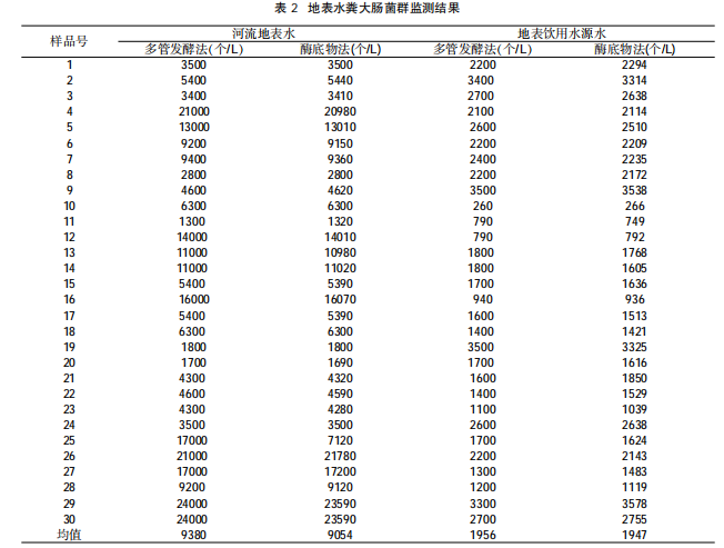 此次試驗各取慶陽市蒲河地下水和巴家咀飲 用水資源水 30 份試品各自用酶底物法和多管發(fā)醇 法開展檢測數(shù)據(jù)分析袁結(jié)果見表 2。