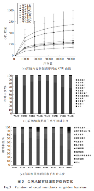 2)高抗性淀粉干涉4星期過后,盲腸中厚壁菌門的總量降低,擬桿菌門和形變菌門的數(shù)目提升;象征性優(yōu)點(diǎn)病菌瘤胃革蘭陰性桿菌科、毛螺菌科、擬桿菌科S24-7組和梭菌屬的進(jìn)化速率提升,合理緩解了因高脂肪飲食搭配造成 的盲腸有益菌失調(diào)。