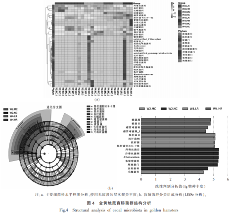 歸類構(gòu)成剖析(LEfSe剖析)如圖所示4b所顯示。高、小劑量HRS組飼養(yǎng)4周與空缺對照實(shí)驗(yàn)、實(shí)體模型組飼養(yǎng)2周時(shí)盲腸內(nèi)容物中好幾個(gè)歸類群存有明顯差別。與其他組對比,在其中小劑量HRS干涉4周時(shí)擬桿菌的進(jìn)化速率高,高使用量HRS干涉組有益菌關(guān)鍵為瘤胃革蘭陰性桿菌科(Ruminococcaceae)和梭菌屬(Clostridia)。