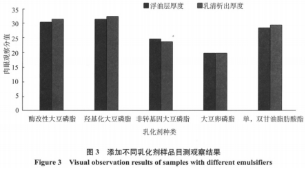 由圖3能夠看得出,加上酶改性材料大豆卵磷脂試品、甲基化大豆卵磷脂試品和單,雙凡士林油酸酯試品的估測觀查得分相對性較高,且區(qū)別不顯著,根據(jù)置放1周商品的估測觀查結果沒法挑選出最合適的破乳劑。